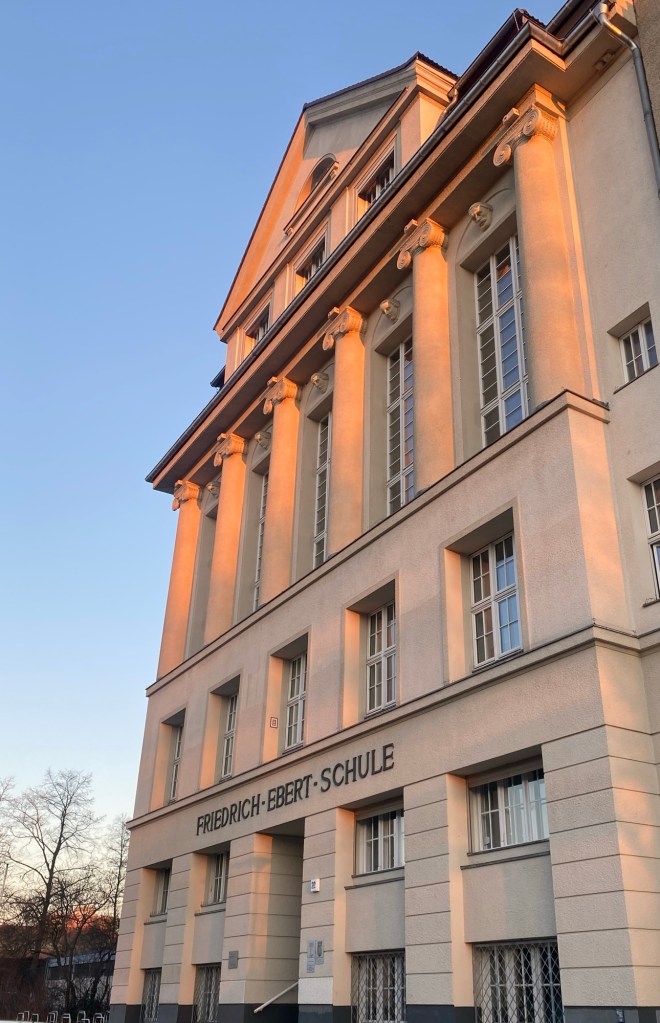 Und an manchen Tagen komme ich gerade rechtzeitig, um das Spiel der Sonnenstrahlen auf der altehrwürdigen Fassade unserer Schule zu betrachten.
