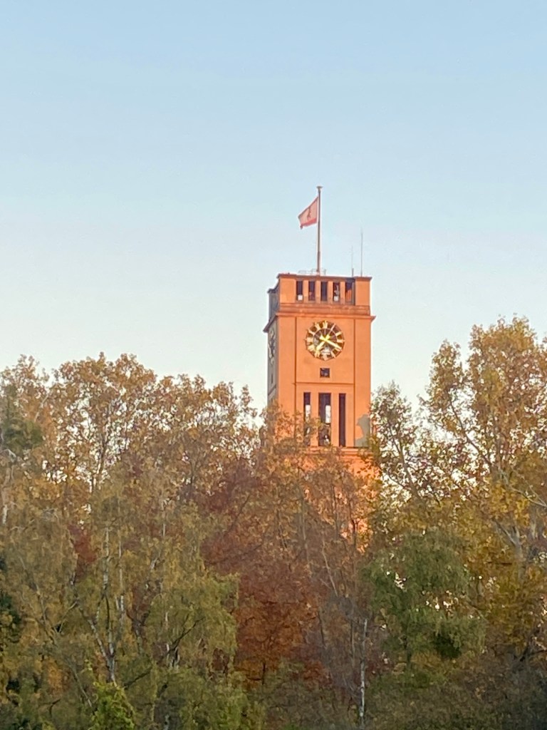 Dazu kommt die Zeit, die ich mir schenke, Zeit, in denen Gedanken schweifen können, aber auch Zeit für Bilder, wie den Turm des Rathauses von Schöneberg, das in der aufgehenden Morgensonne orange leuchtet.
