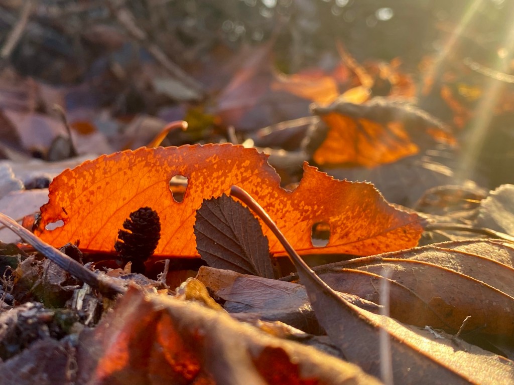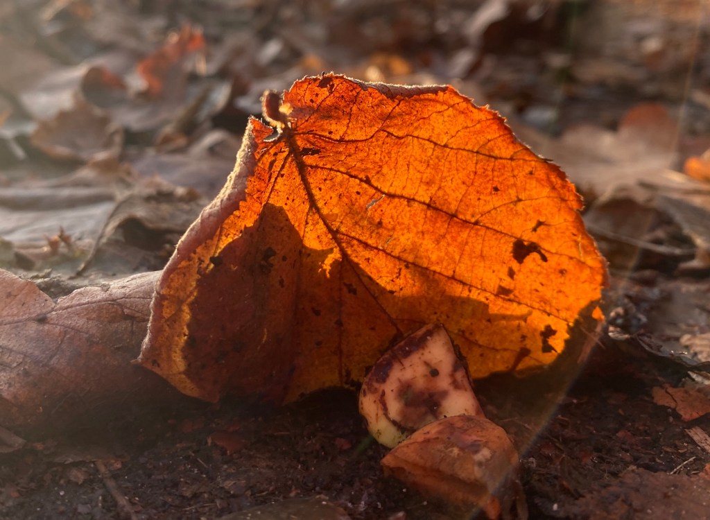 Blätter im Herbst sind Symbole für die Ästhetik des Augenblicks. Vom Verfall gezeichnet leuchten sie dennoch in der durchscheinenden Morgensonne zu wahren Lichtkunstwerken auf. Und auch wenn das Blatt anscheinend stirbt, so ist es doch nur Teil des großen Ganzen, in diesem Fall des Baumes, der zur Ruhe kommt, um im kommenden Jahr mit frischer Kraft weiterleben zu können.